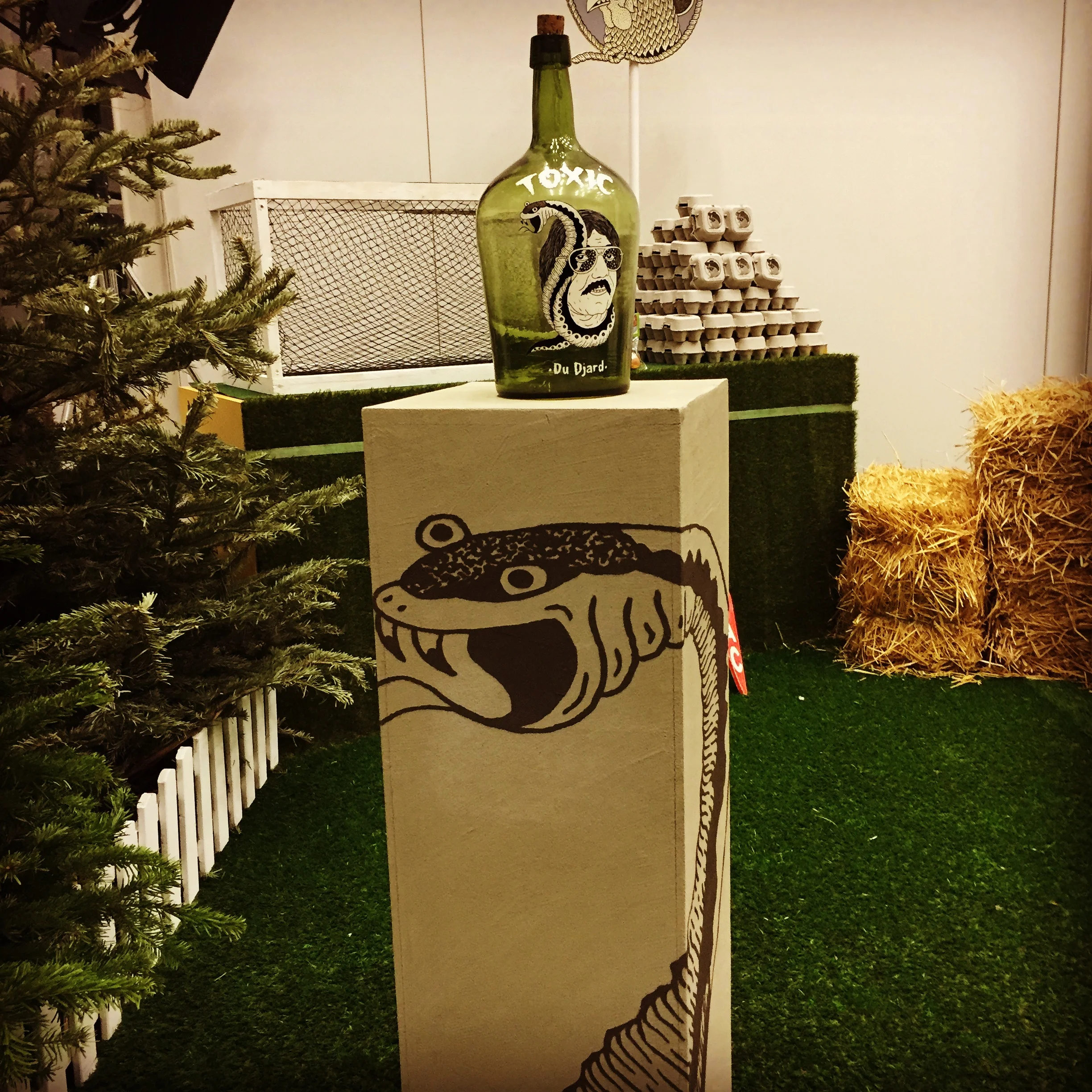 Présentation sur présentoir béton et Stamp 50/50/110, de "Toxic du Djard"Mathusalem d'eau-de-vie pomme-poire cultiver et distiller par mes soins.